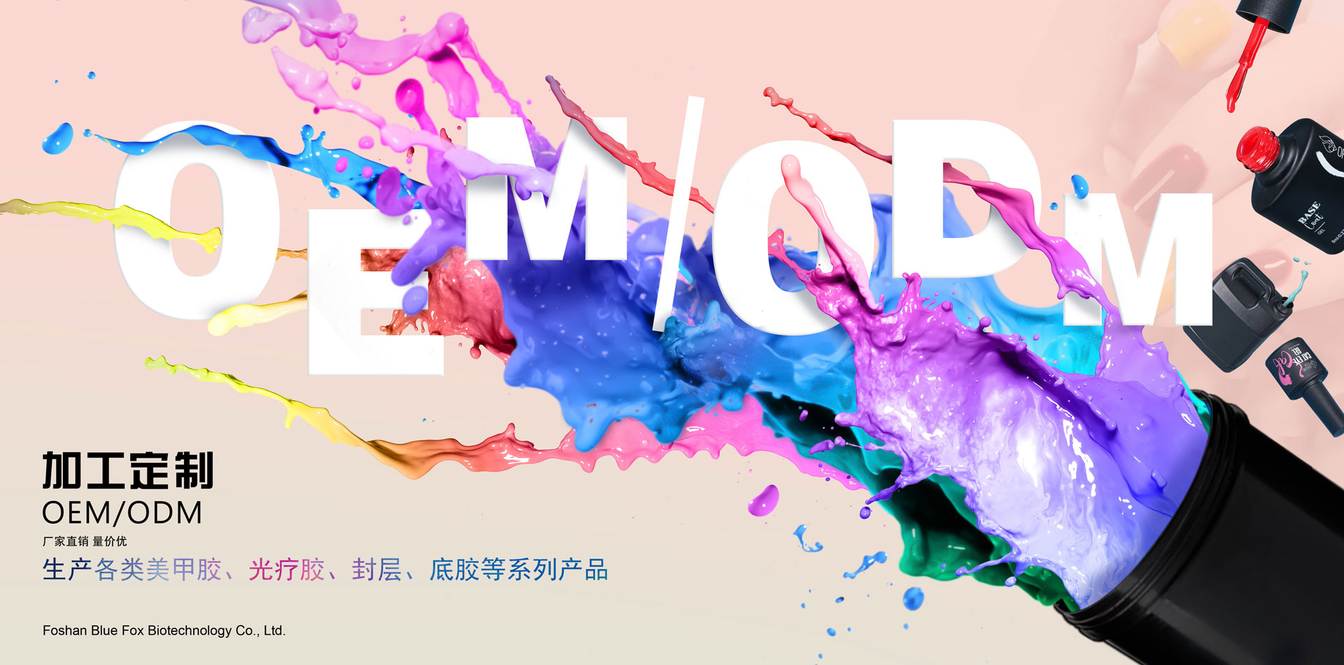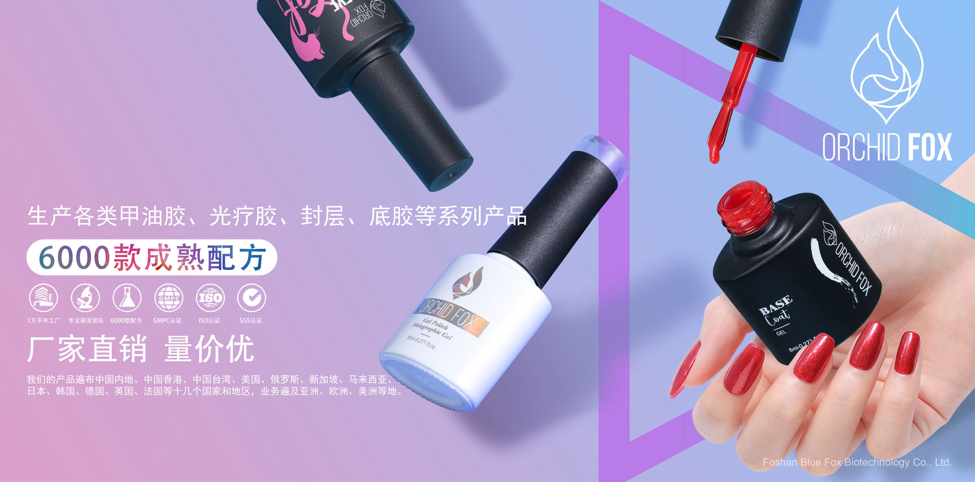 佛山市藍(lán)狐生物科技有限公司(原廣州甲逸妝品有限公司)位于廣東省佛山市科技工業(yè)園內(nèi),擁有自主研發(fā)的生產(chǎn)基地,十萬級(jí)GMP化妝品生產(chǎn)車間,高級(jí)實(shí)驗(yàn)室和研發(fā)團(tuán)隊(duì),和商品進(jìn)出口權(quán),已獲得歐美ISO22716、GMPC質(zhì)量體系及SGS認(rèn)證. 公司致力于美甲產(chǎn)品的研發(fā)和生產(chǎn),主要生產(chǎn)美甲膠、指甲油、Polygel、水晶粉、光療延長(zhǎng)膠、底膠、封層、各種功能膠及大包裝基料。現(xiàn)公司旗下創(chuàng)立“甲逸 ” “十指繡””SZXvenus””O(jiān)RCHID FOX”美甲品牌,提供各類美甲OEM/ODM代加工基料及產(chǎn)品備案服務(wù),公司擁有雄厚的科研力量和高效的生產(chǎn)能力,同時(shí)在不斷提高產(chǎn)品質(zhì)量并開發(fā)新產(chǎn)品,形成了廣泛的銷售網(wǎng)絡(luò),已得到國(guó)內(nèi)外客戶高度認(rèn)可。 我們始終追求“以人為本,誠(chéng)實(shí)守信”的經(jīng)營(yíng)理念,并貫徹于研發(fā)、生產(chǎn)、銷售和售后服務(wù)的各個(gè)環(huán)節(jié)。公司堅(jiān)持開發(fā)環(huán)保優(yōu)質(zhì)的美甲產(chǎn)品,倡導(dǎo)美甲行業(yè)健康發(fā)展!